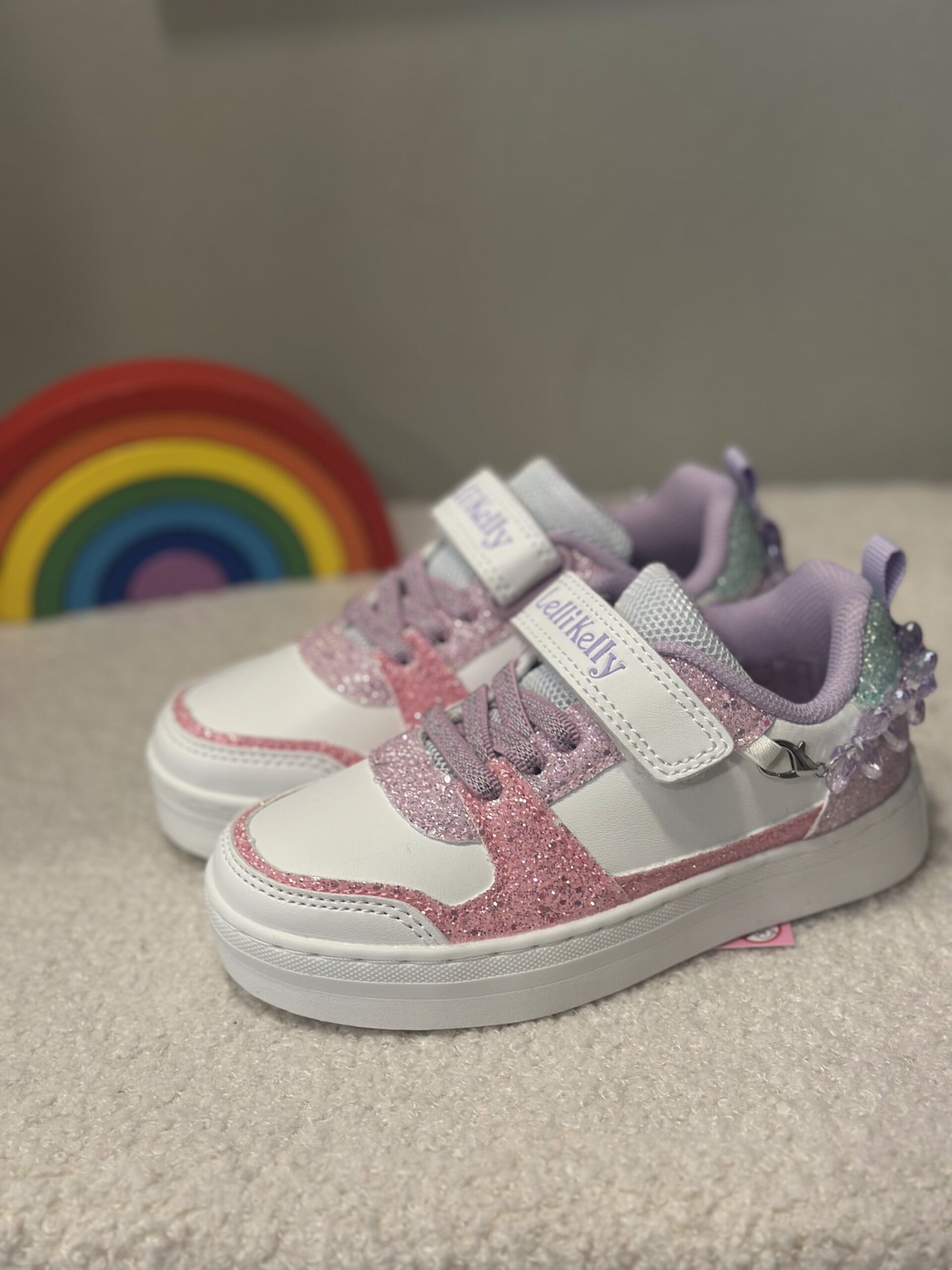 Questa sneakers è super luminosa grazie ai suoi bellissimi glitter, sul tallone ha un bellissimo braccialetto che può essere indossato. I lacci sono elastici ed ha la chiusura con velcro, sono di Lelli Kelly, un brand , una garanzia.