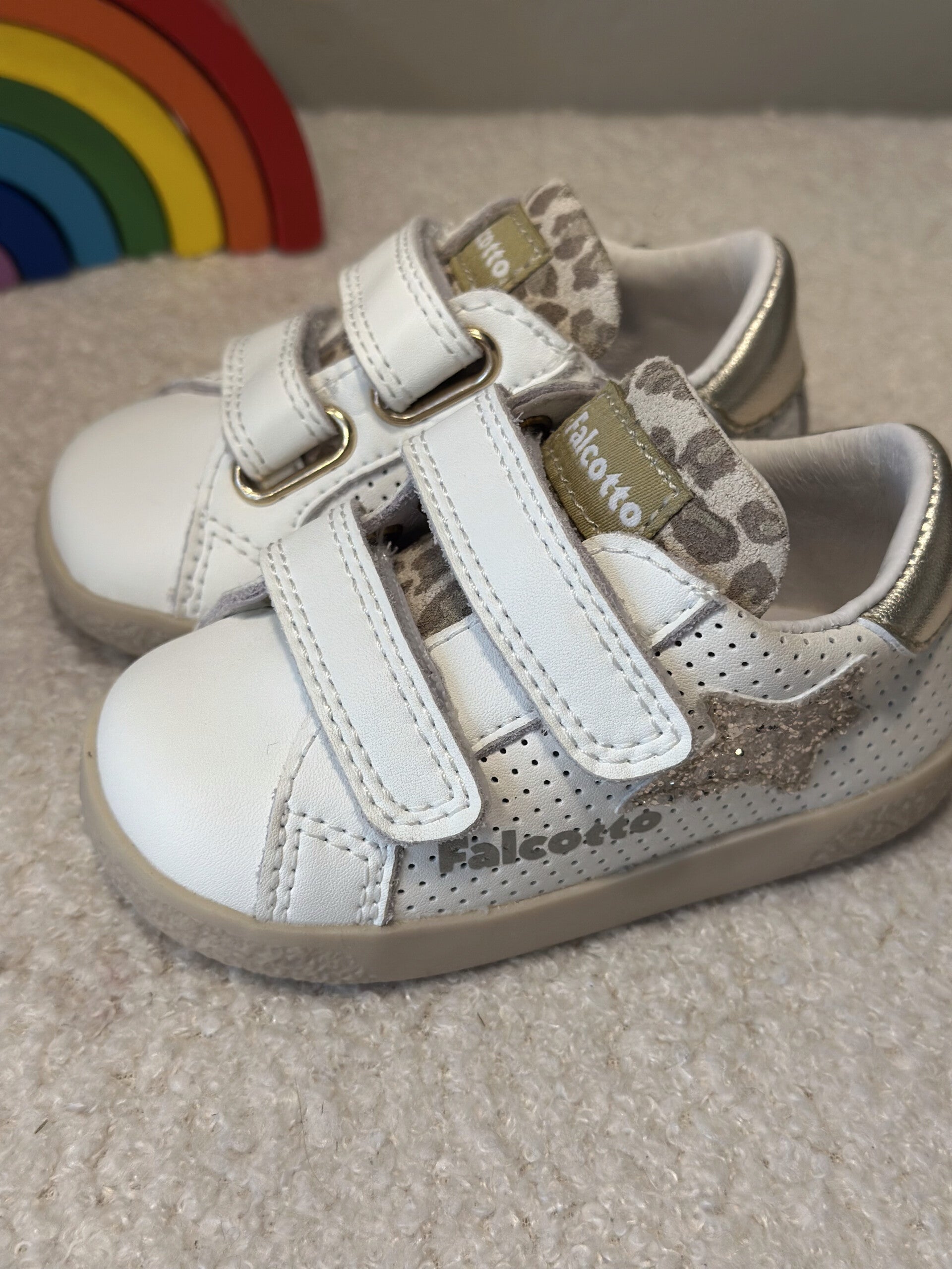 Meravigliosa sneakers di Falcotto con stella glitterata e dettagli leopardati. Ideale per tutte le occasioni.