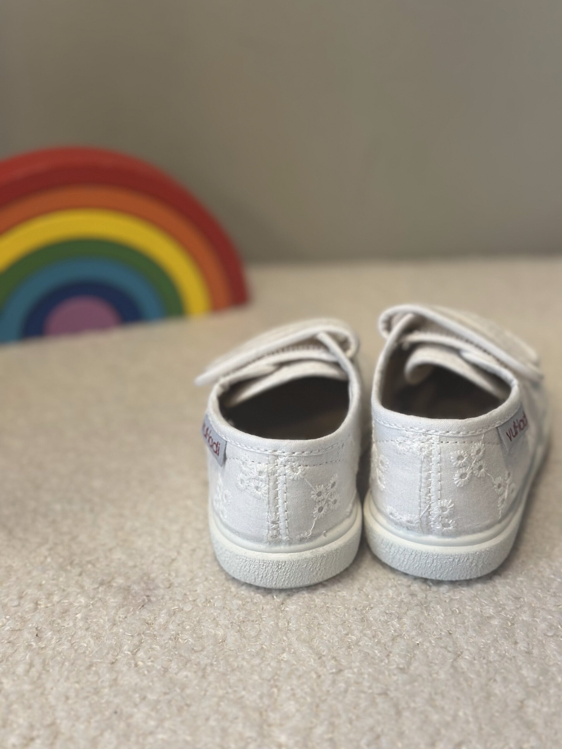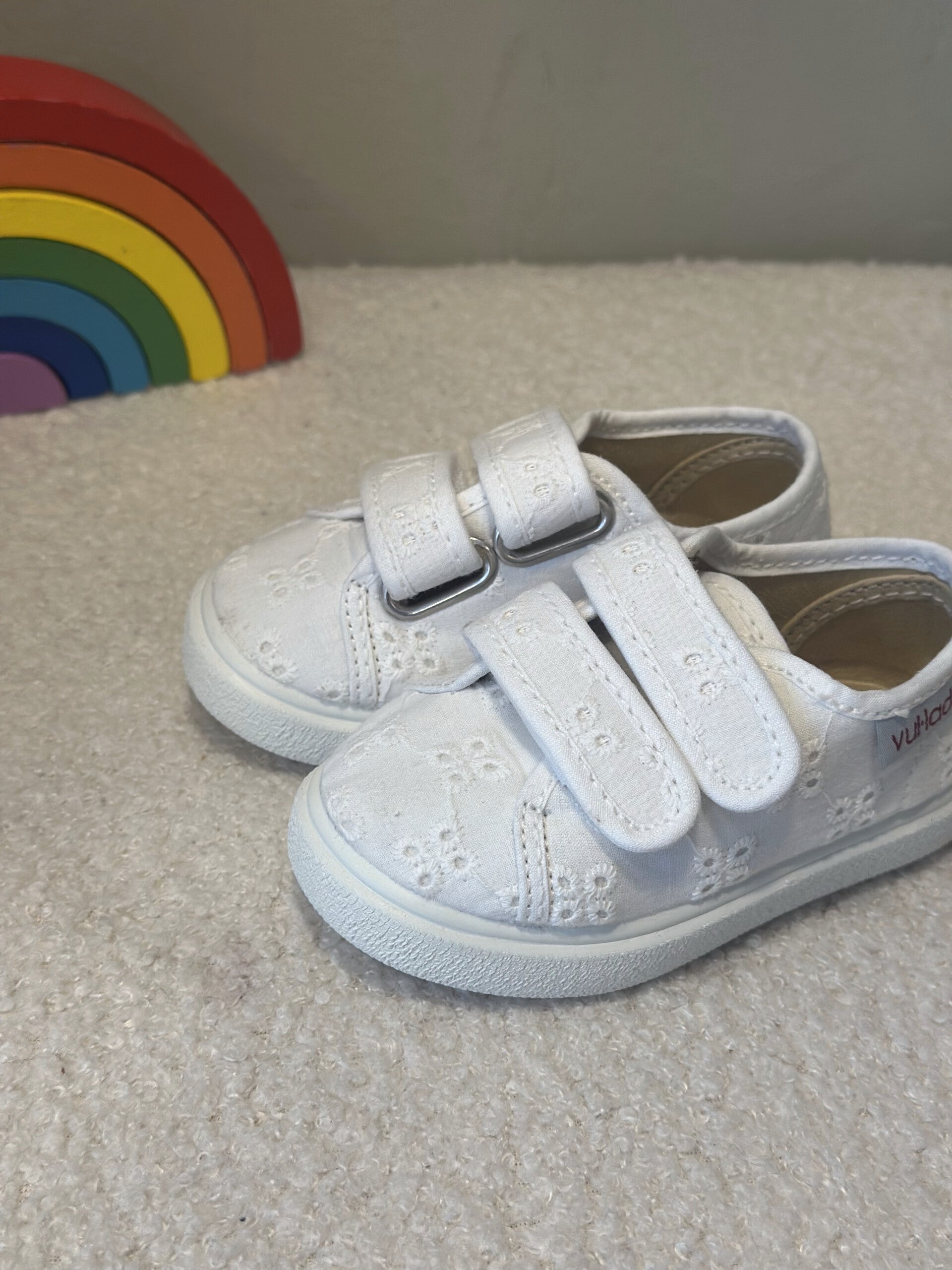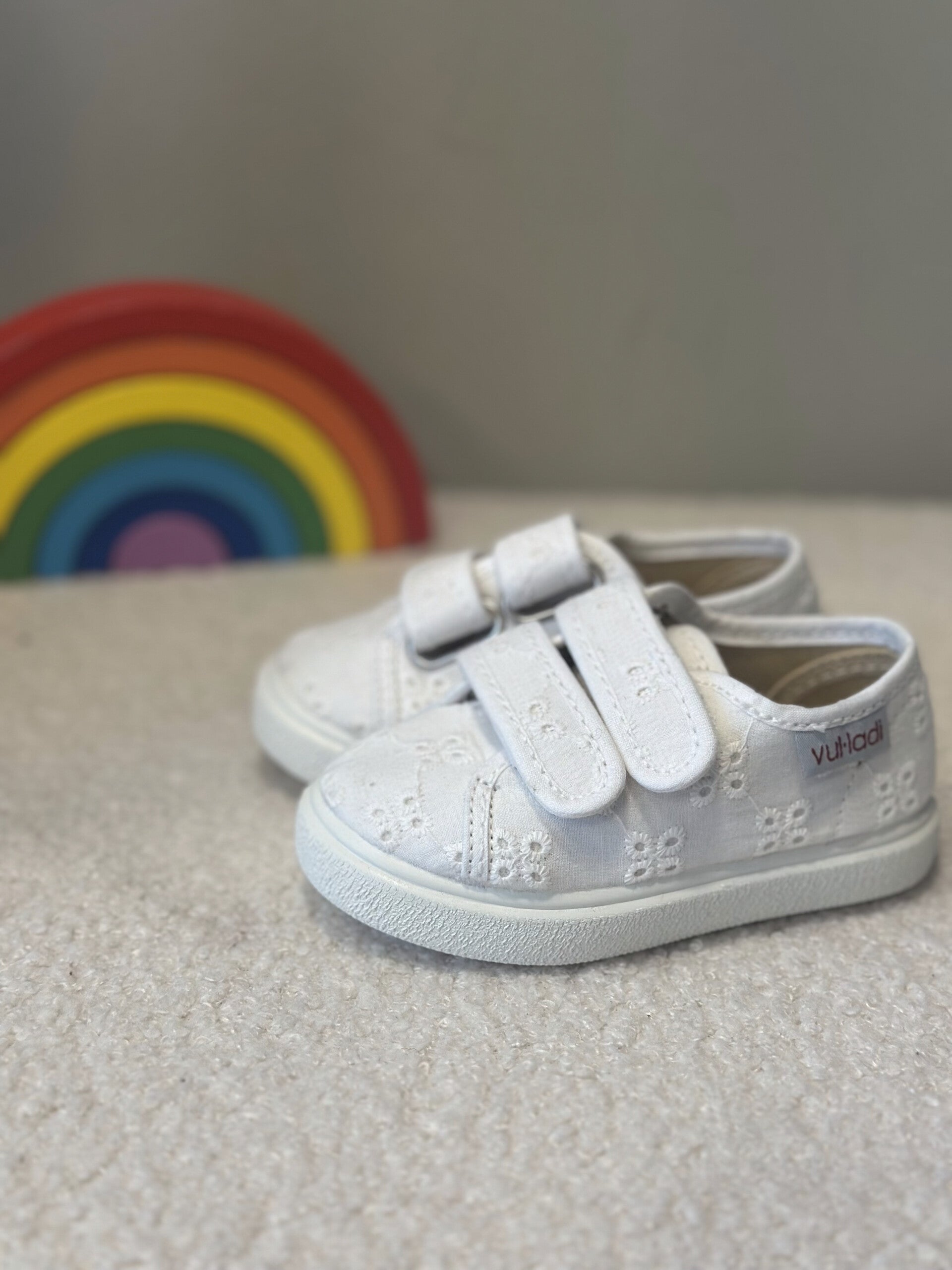 Sneakers con tessuto san gallo, con chiusura in velcro, comode e super versatili.