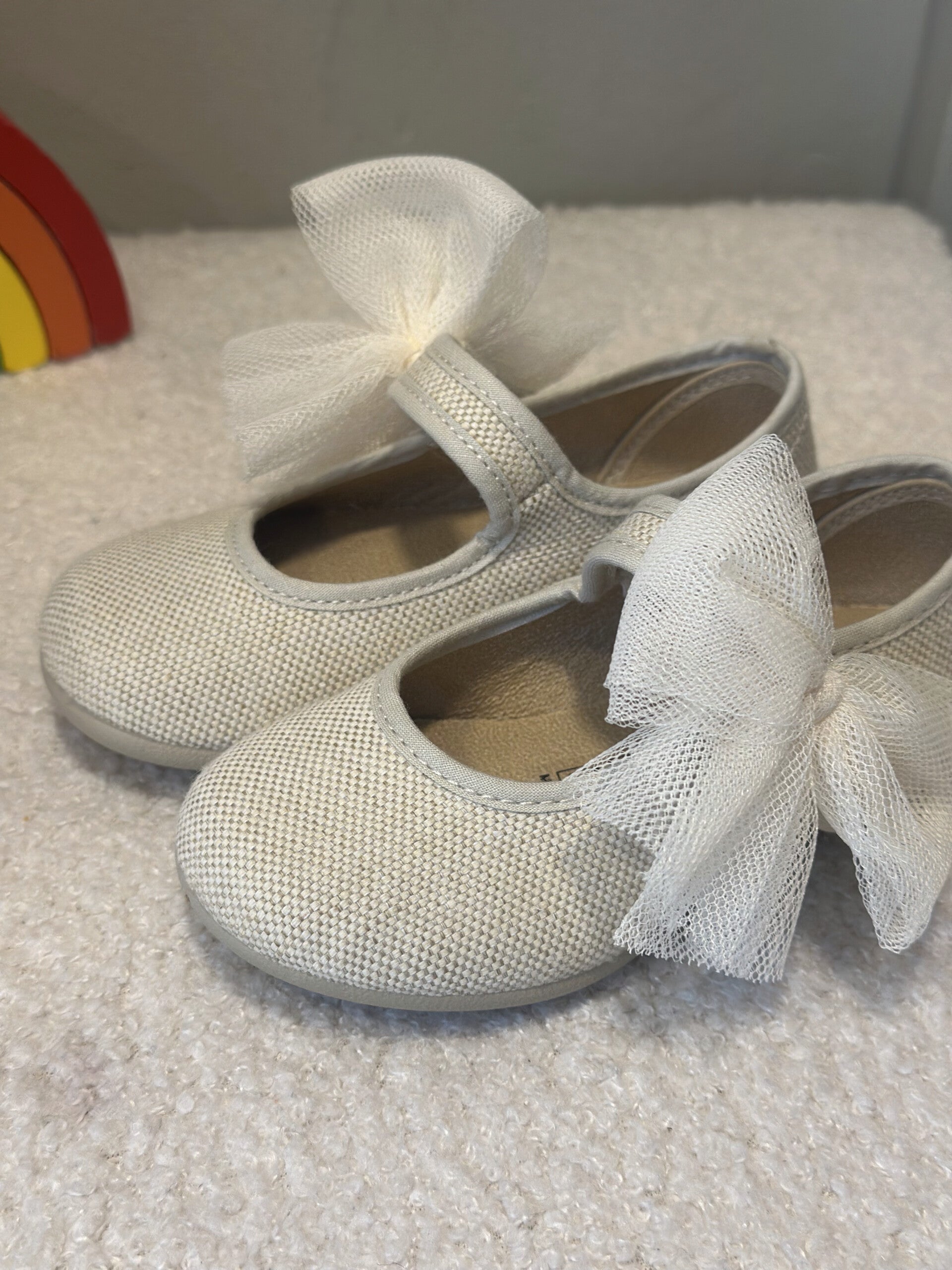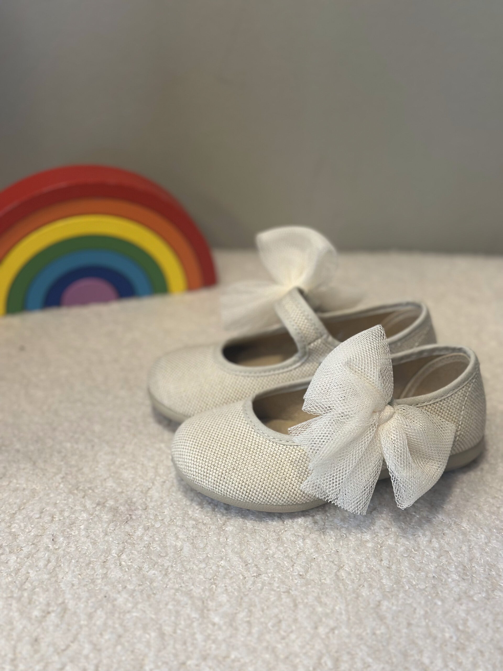 Ballerine con chiusura velcro e fiocco in tulle amovibile, super neutre e versatili.